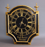 Twelve inch Dial, Mahogany 8-day Fusee Wall Timepiece by Foster. c1870 - SOLDSOLD Mahogany dial timepiece by Foster of London. 8-day spring powered, chain fusee movement with anchor escapement. Shaped four pillar movement plates. 12" white dial with Roman numerals and black steel spade hands. 15 1/2" full diameter and 6 1/2" deep. Brass plaque below the dial stamped 1030. Pendulum also stamped 1030. Robert Berry Verge Tavern Timepiece. c1750 - SOLDSOLD A George II rare small gilt and black japanned tavern timepiece with verge escapement signed Robt. Berry, Hitchin. c1750. The dial is 15 inches diameter with Roman hour numerals and Arabic minute numbers every five minutes. The hands are brass with pierced hour hand. The timepiece is signed below the dial.The 8-day plated fusee movement is spring powered with verge and crownwheel escapement and short bob pendulum with holdfast. The timepiece is 24" high, 19" wide and 6" deep. Mahogany Hooded wall clock with painted dial signed Will’m Beavington, Stourbridge. c1795Hooded wall clock